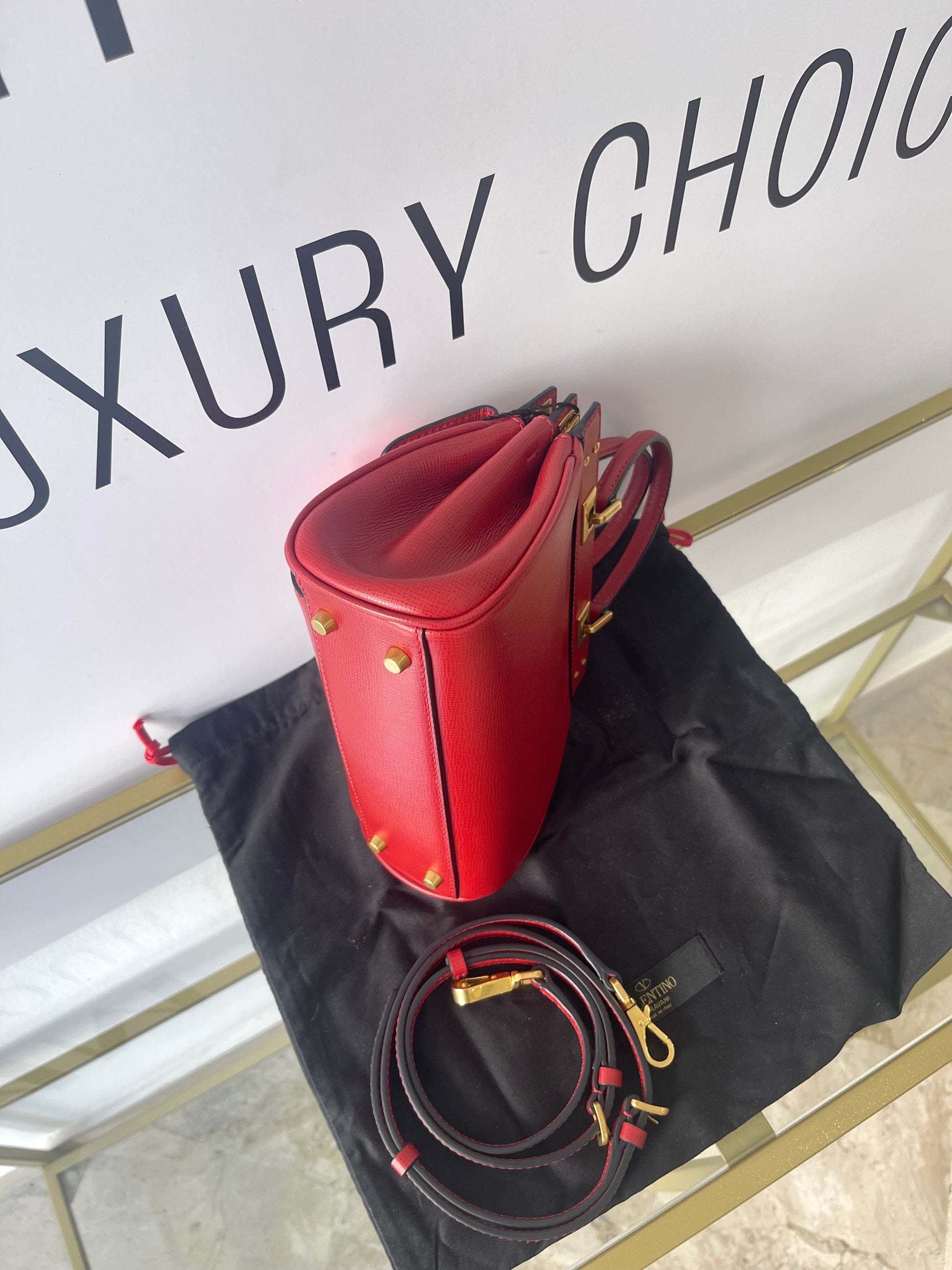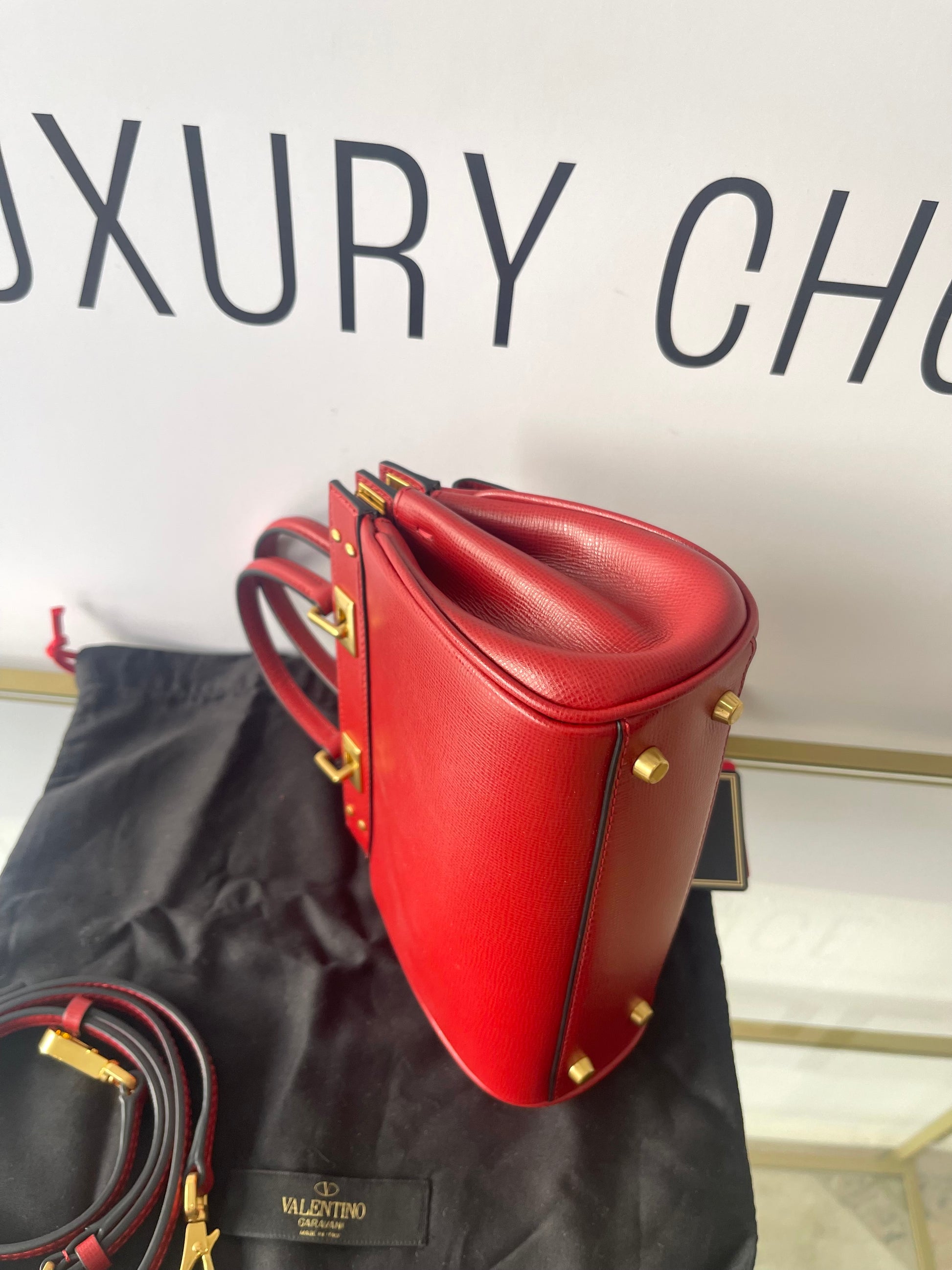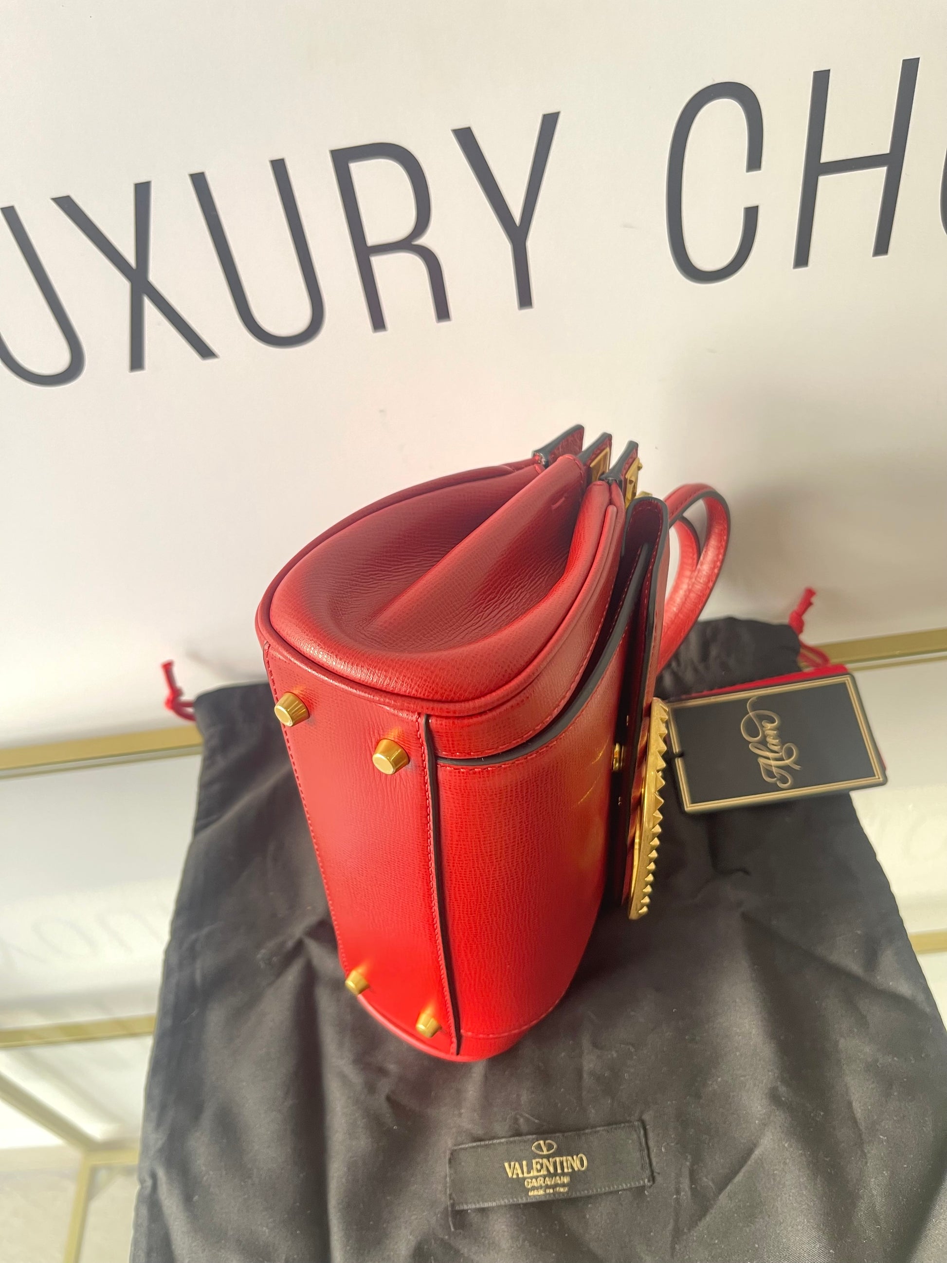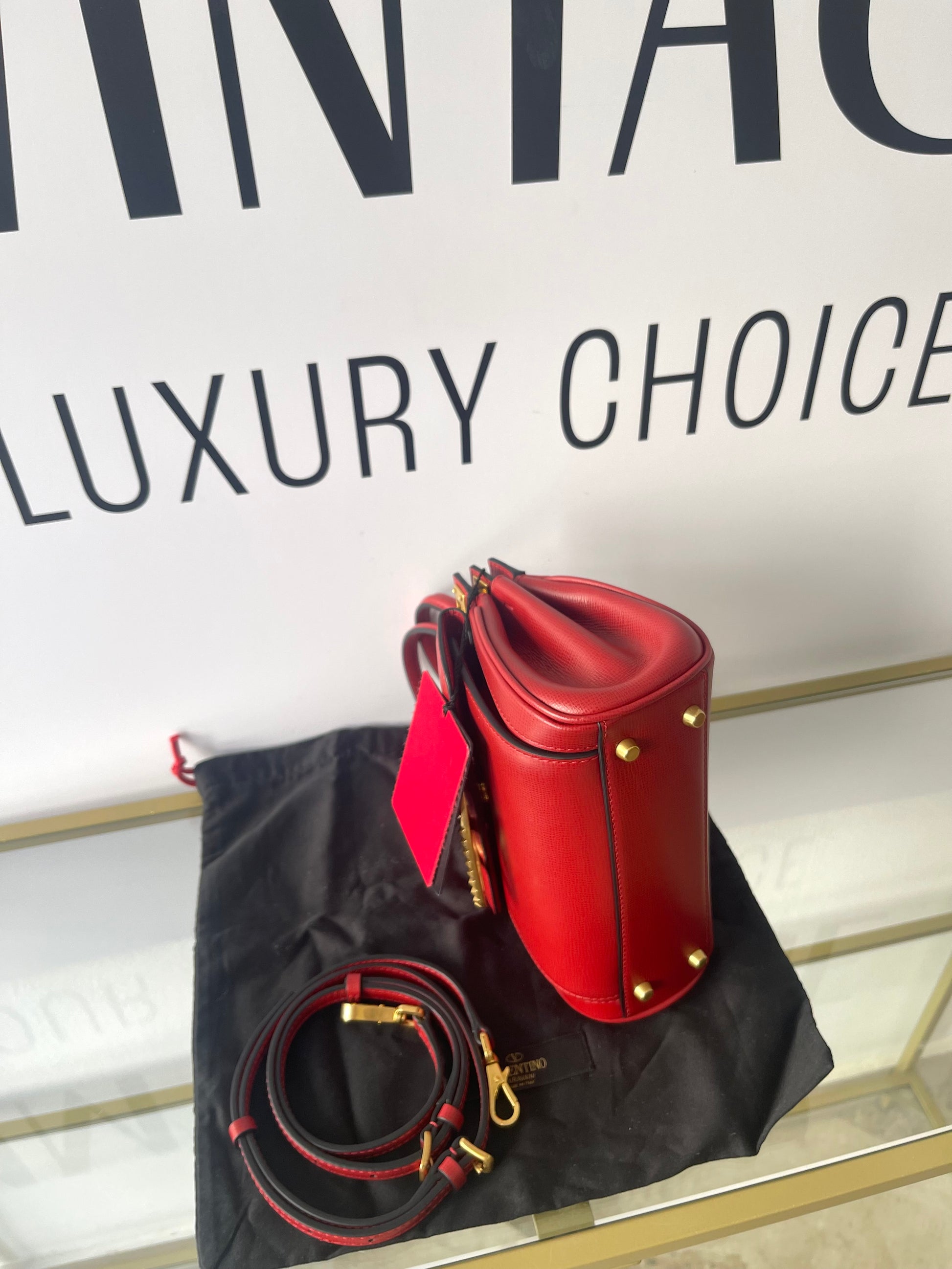 Borsa Rockstud Alcove Valentino Garavani in pelle granata rossa.Borsa con manico superiore in pelle granulata in rosso. Manici per il trasporto doppio nella parte superiore. Hardware per il logo e tasca con patta con chiusura magnetica a bottone a pressione sul viso. Pannello a fisarmonica ai lati. Borchie del paraurti alla base. Chiusure Turn-lock nel vano principale. Tasca con cerniera, tasca con patta e timbro del logo all'interno a due parti. Fodera in pelle lucidata in rosso.Pari a nuovo, completa di dustbag,etichetta e tracolla regolabile ed estraibile.Misure: 19x14x5 cmLuce tracolla: 46cm