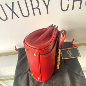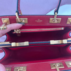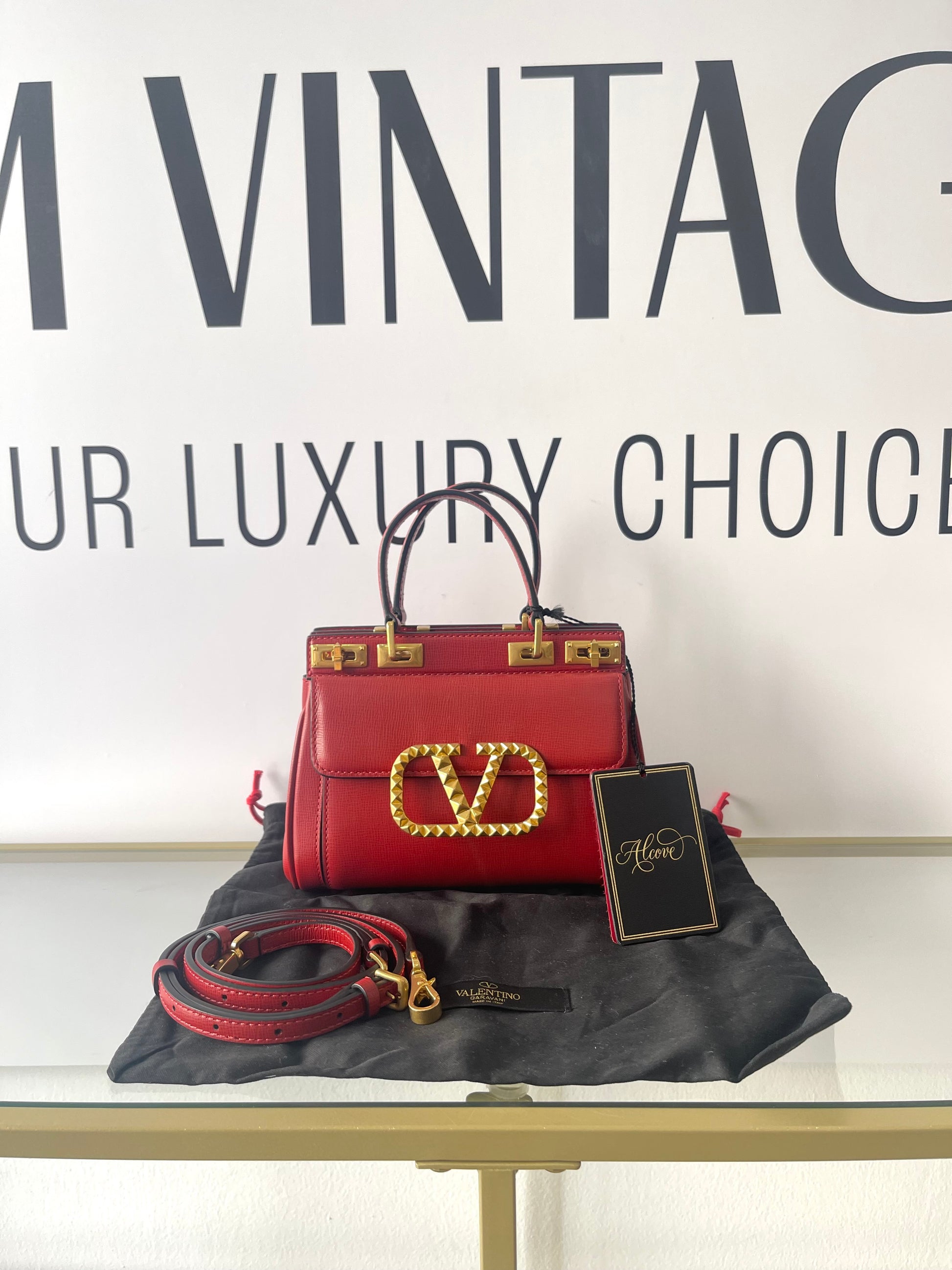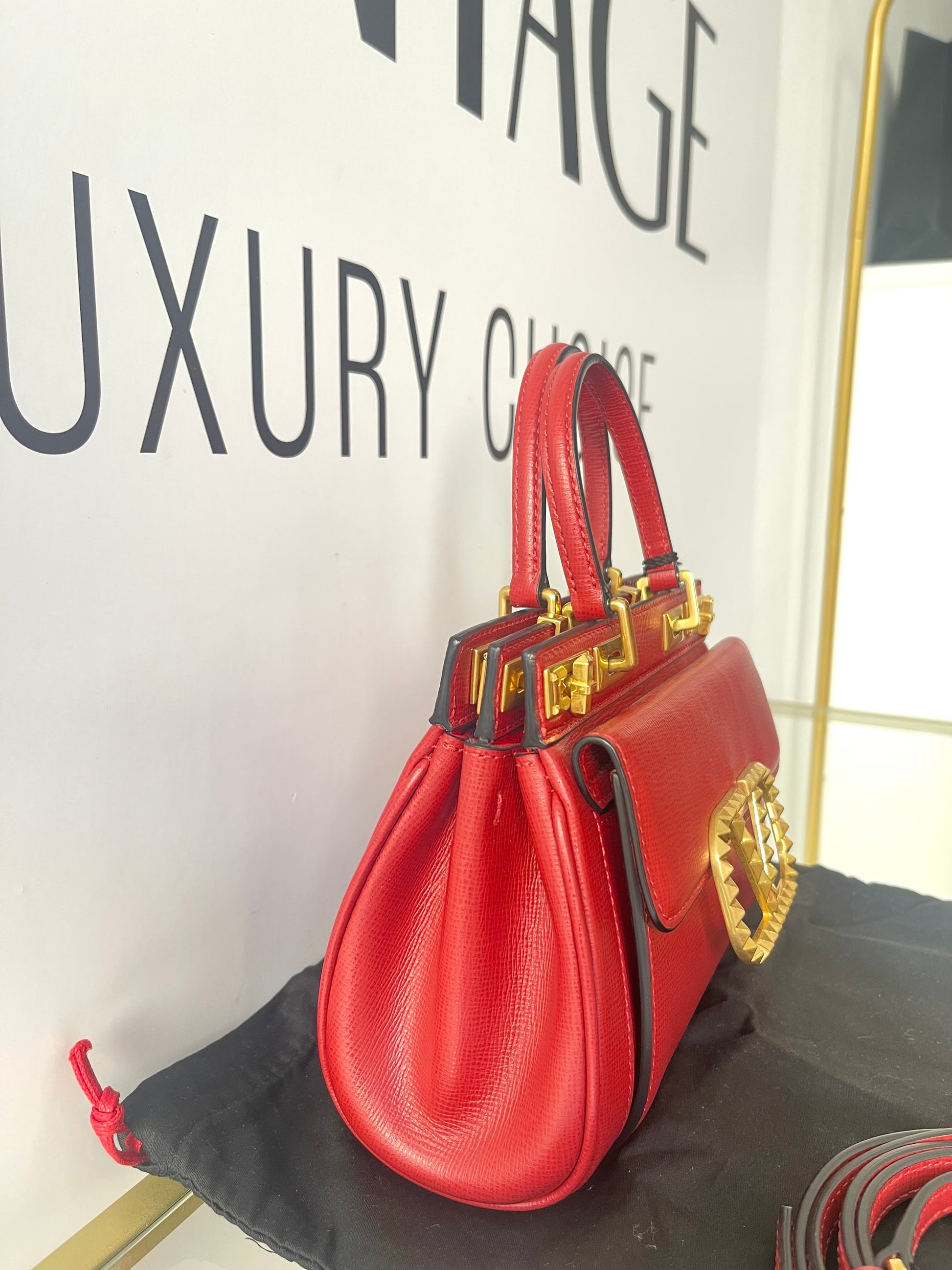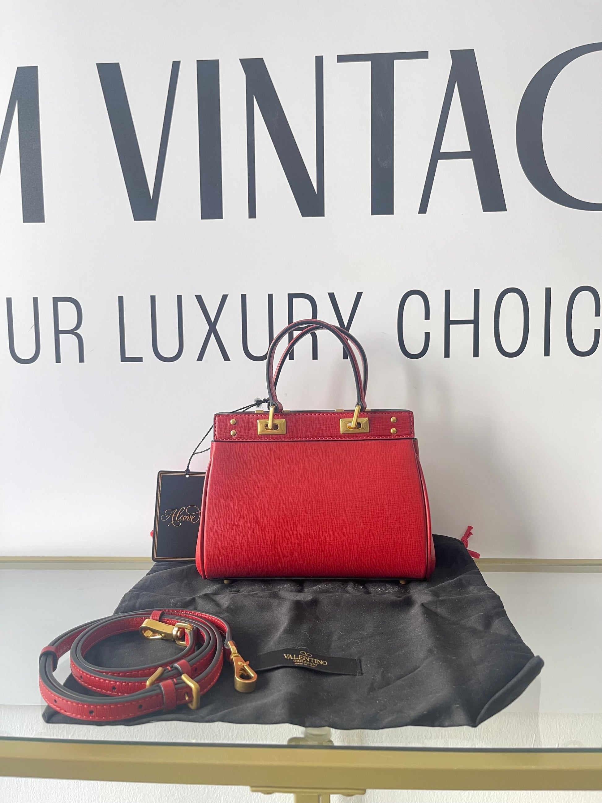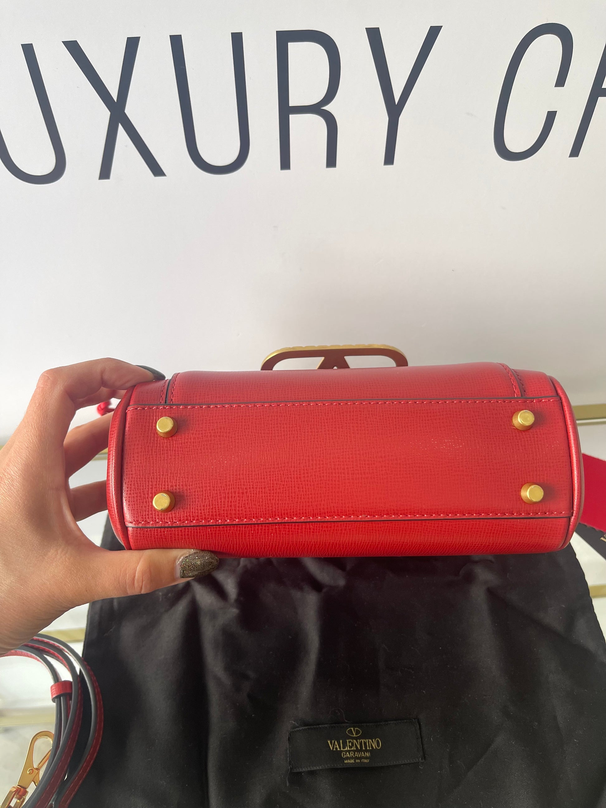 Borsa Rockstud Alcove Valentino Garavani in pelle granata rossa.Borsa con manico superiore in pelle granulata in rosso. Manici per il trasporto doppio nella parte superiore. Hardware per il logo e tasca con patta con chiusura magnetica a bottone a pressione sul viso. Pannello a fisarmonica ai lati. Borchie del paraurti alla base. Chiusure Turn-lock nel vano principale. Tasca con cerniera, tasca con patta e timbro del logo all'interno a due parti. Fodera in pelle lucidata in rosso.Pari a nuovo, completa di dustbag,etichetta e tracolla regolabile ed estraibile.Misure: 19x14x5 cmLuce tracolla: 46cm
