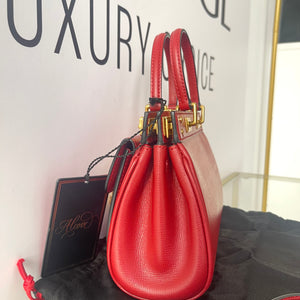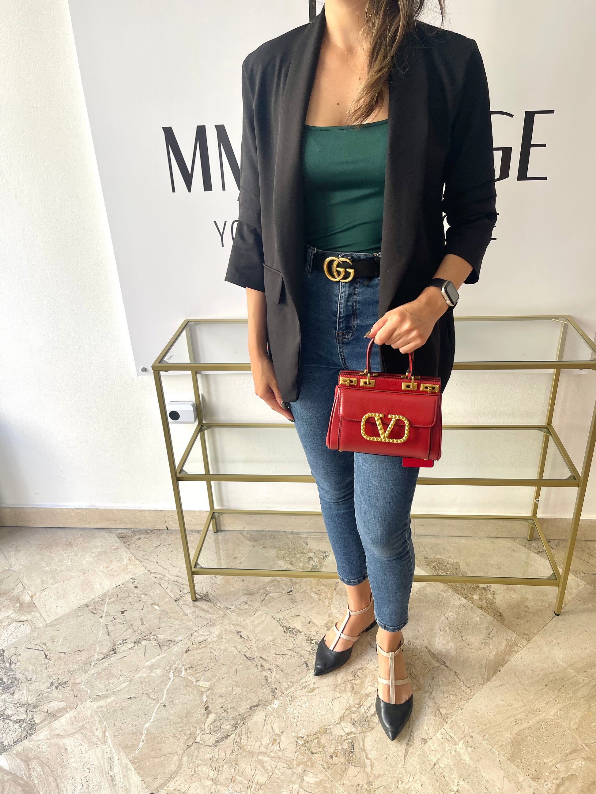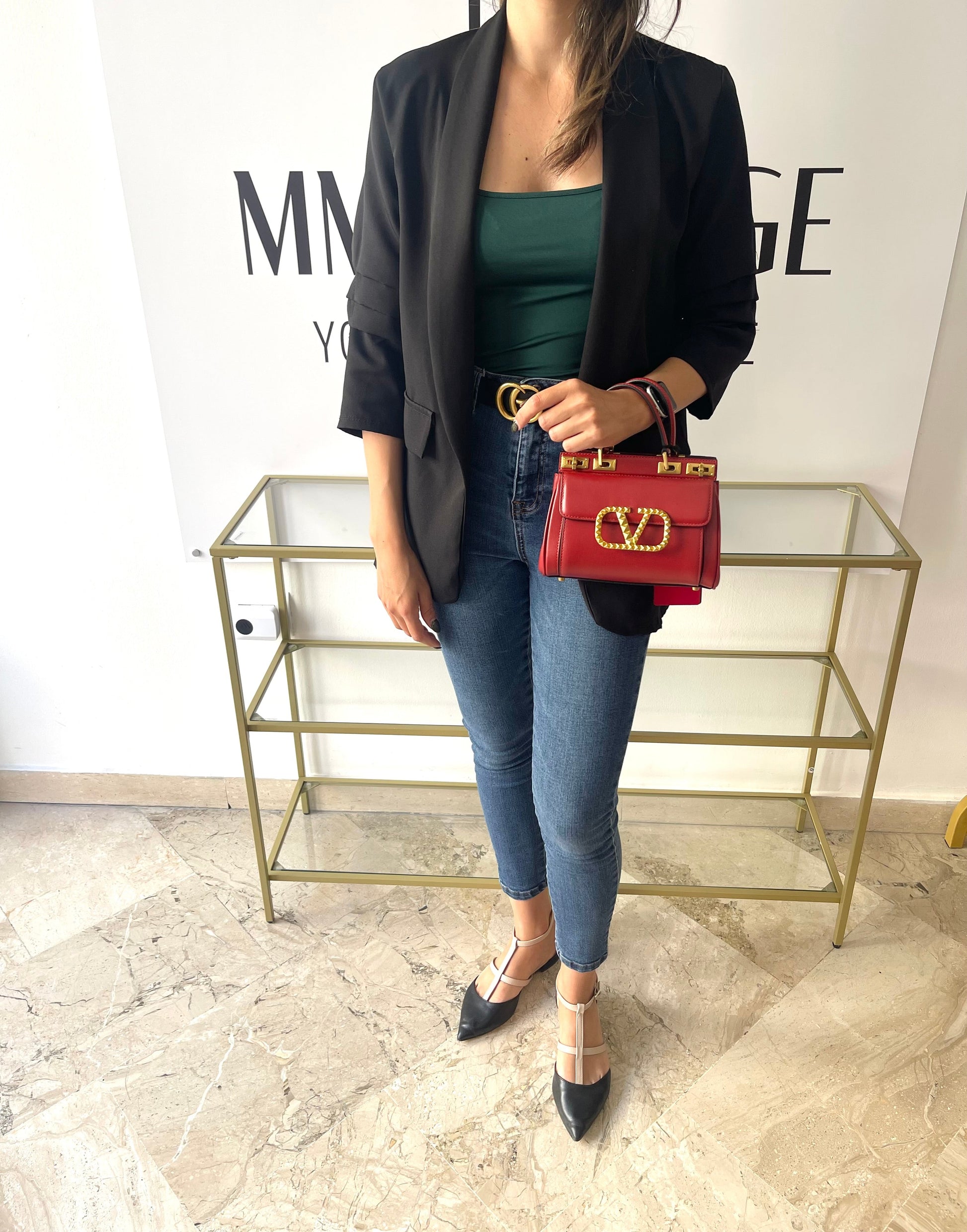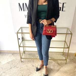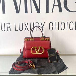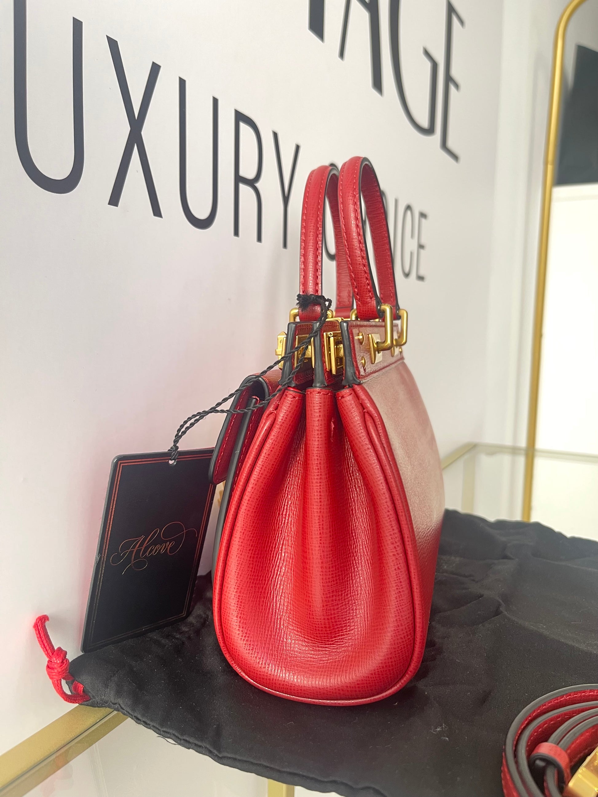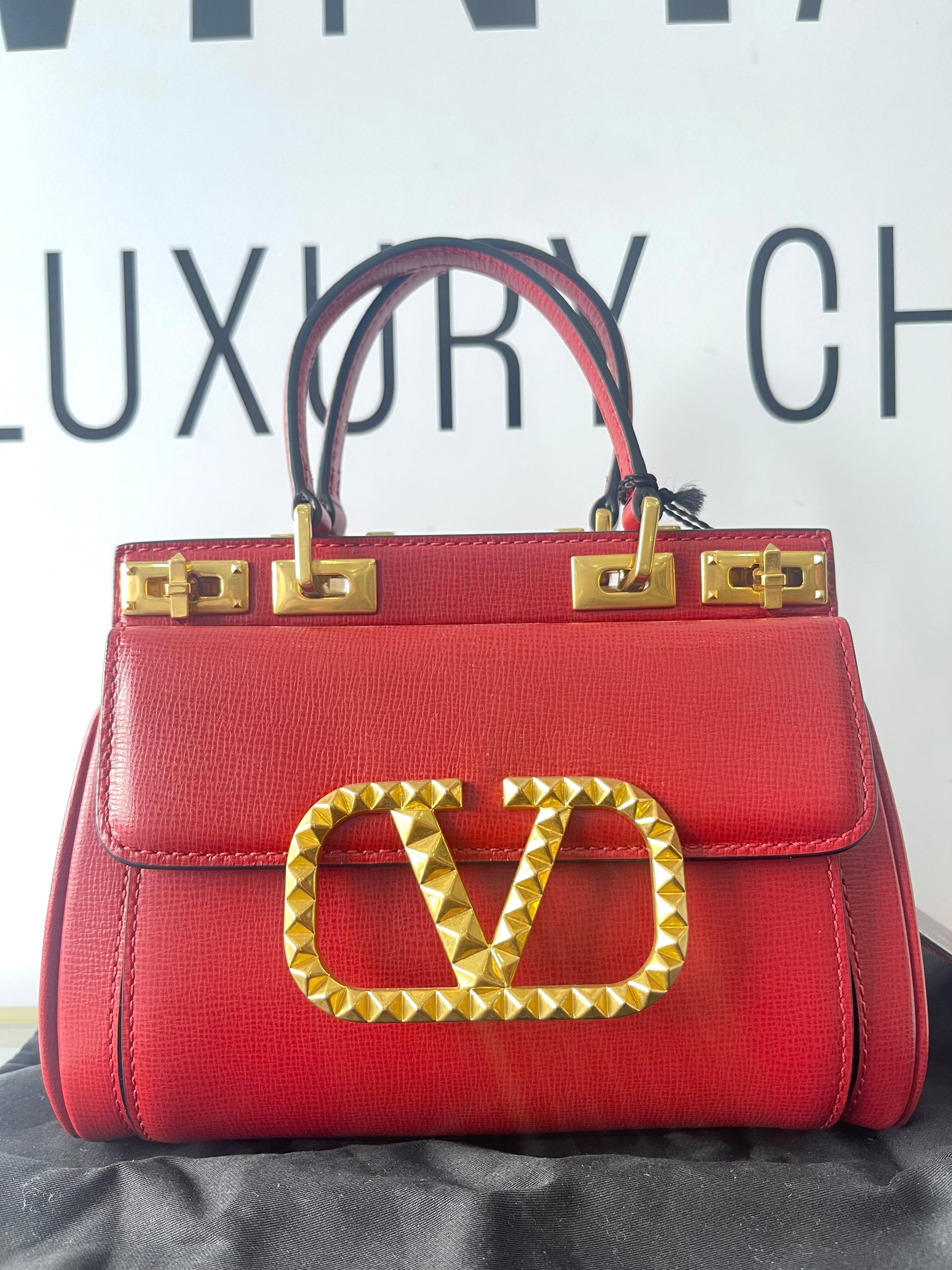 Borsa Rockstud Alcove Valentino Garavani in pelle granata rossa.Borsa con manico superiore in pelle granulata in rosso. Manici per il trasporto doppio nella parte superiore. Hardware per il logo e tasca con patta con chiusura magnetica a bottone a pressione sul viso. Pannello a fisarmonica ai lati. Borchie del paraurti alla base. Chiusure Turn-lock nel vano principale. Tasca con cerniera, tasca con patta e timbro del logo all'interno a due parti. Fodera in pelle lucidata in rosso.Pari a nuovo, completa di dustbag,etichetta e tracolla regolabile ed estraibile.Misure: 19x14x5 cmLuce tracolla: 46cm